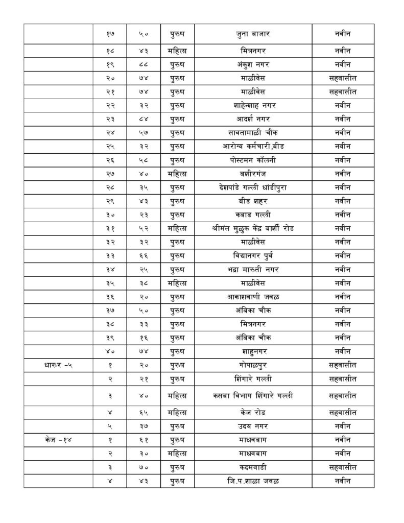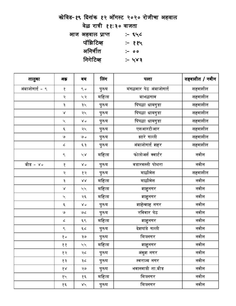 आज बीड जिल्ह्यातून 658 जणांचे स्वॅब तपासणीसाठी पाठवण्यात आले होते त्यात 115 जणांचे अहवाल पॉझिटिव्ह आले आहेत