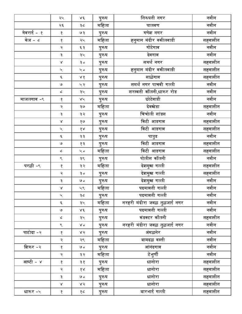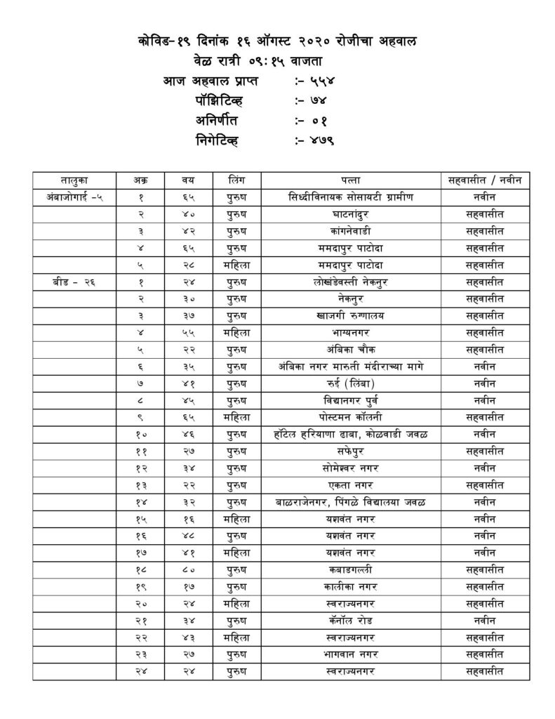 Beed Corona update: आज दि 16 ऑगस्ट रोजी प्राप्त झालेल्या अहवालात जिल्ह्यात 74 पॉझिटिव्ह रुग्ण आढळून आले आहेत