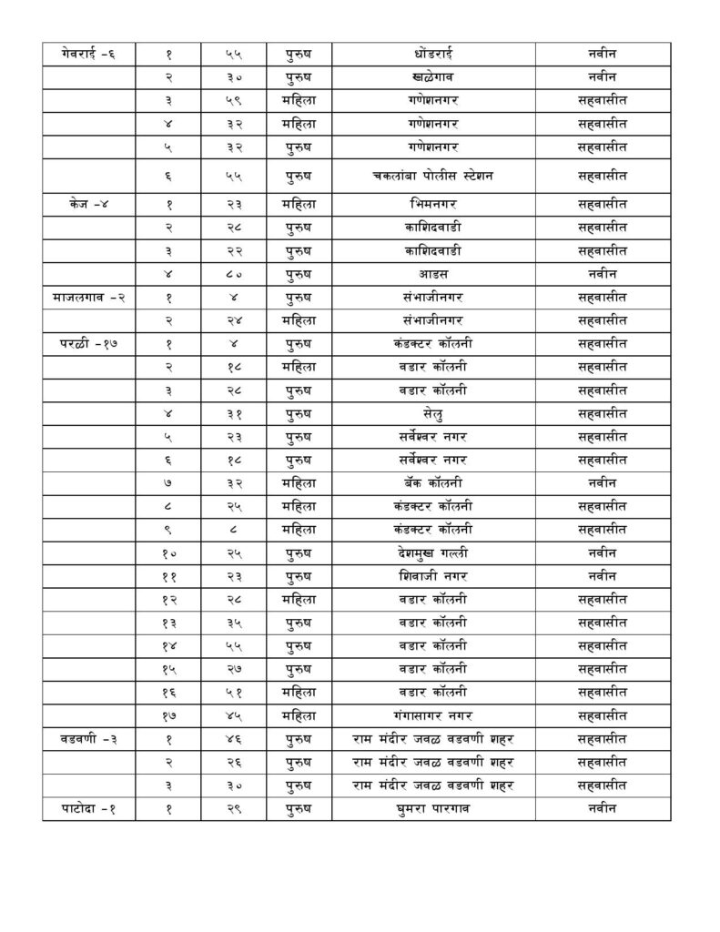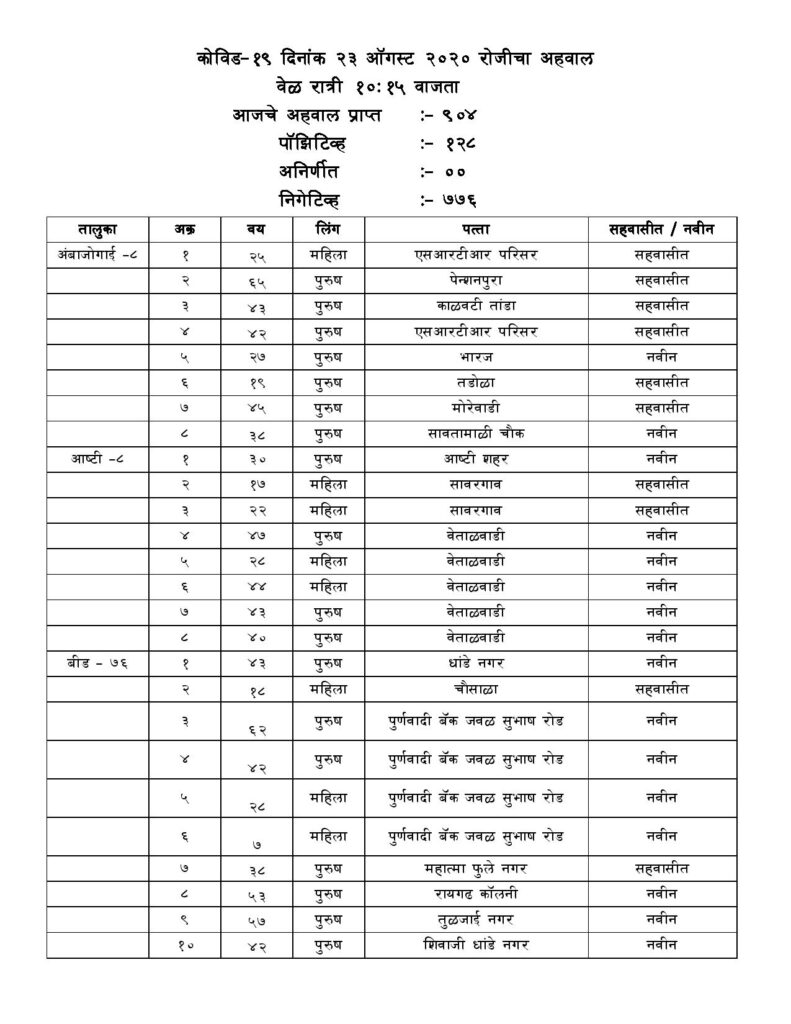 अंबाजोगाई 08, बीड 76,आष्टी 08, धारूर 03, माजलगाव 02 गेवराई 06, परळी 17, वडवणी 03, पाटोदा 01, केज04, एकुण 128 रूग्णाची भर बीड जिल्ह्यात झाली आहे.
