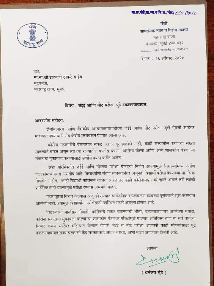 JEE आणि #NEET या दोन्ही परीक्षा कोविड महामारीचे संकट व विद्यार्थ्यांची मागणी लक्षात घेत काही महिन्यांसाठी पुढे ढकलण्यात याव्यात अशी मागणी केंद्र सरकारकडे करावी, अशी मागणी आज पत्राद्वारे मुख्यमंत्री उद्धव ठाकरे व उपमुख्यमंत्री अजितदादा पवार यांना धनंजय मुंडे यांनी केली आहे.