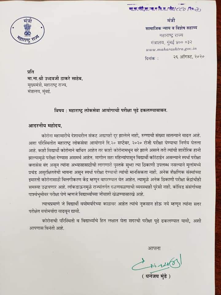 तसेच MPSC ची येत्या २० सप्टेंबरला होणारी परीक्षा देखील विद्यार्थ्यांची मागणी लक्षात घेत पुढे ढकलण्यात यावी व त्याचा परिणाम विद्यार्थ्यांच्या वयोमर्यादेवर होऊ देऊ नये अशी मागणीदेखील पत्राद्वारे मा. मुख्यमंत्री व मा. उपमुख्यमंत्री यांना केली आहे असे धनंजय मुंडे यांनी त्यांच्या पत्रामध्ये केले आहे.
