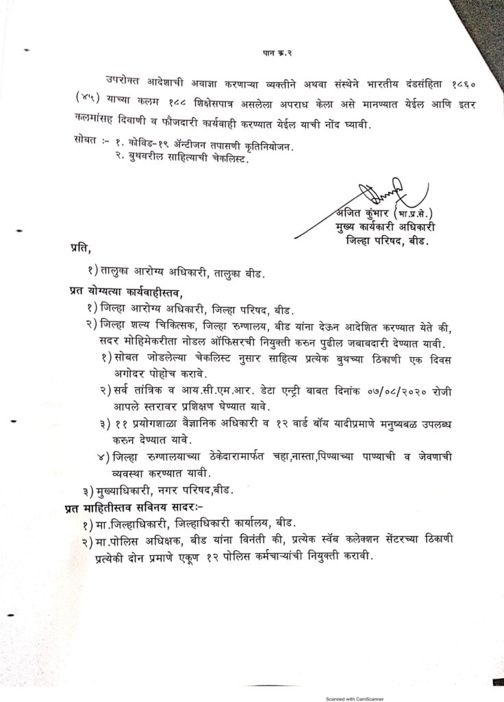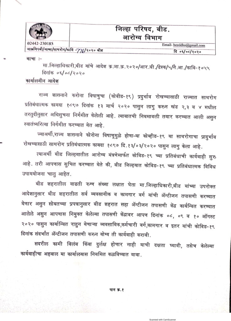 बीड शहरातील वाढती बीडचे जिल्हाधिकारी राहुल रेखावर यांचा आदेशानुसार शहरातील व्यवसायीकचे अॅन्टीजन टेस्ट करण्यात येणार आहे. हि टेस्ट करणे व्यावसायिकसाठी बंधनकारक आहे अन्य कारवाई करण्यात येईल असे आदेश मध्ये म्हणले आहे.