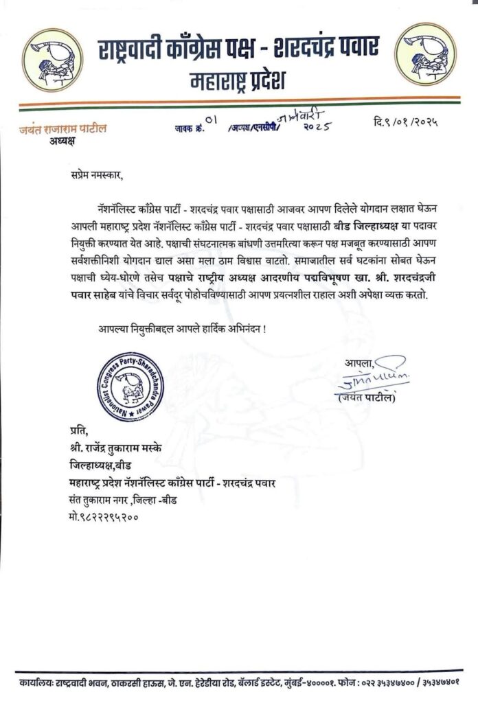 बीड: विधानसभा निवडणुकीच्या पार्श्वभूमीवर भाजप सोडून शरद पवारांच्या राष्ट्रवादी काँग्रेस पार्टीत प्रवेश केलेले राजेंद्र मस्के यांना पार्टीने महत्त्वाची जबाबदारी सोपवली आहे. पार्टीने त्यांना बीड जिल्ह्याचे अध्यक्ष म्हणून नियुक्त केले आहे.