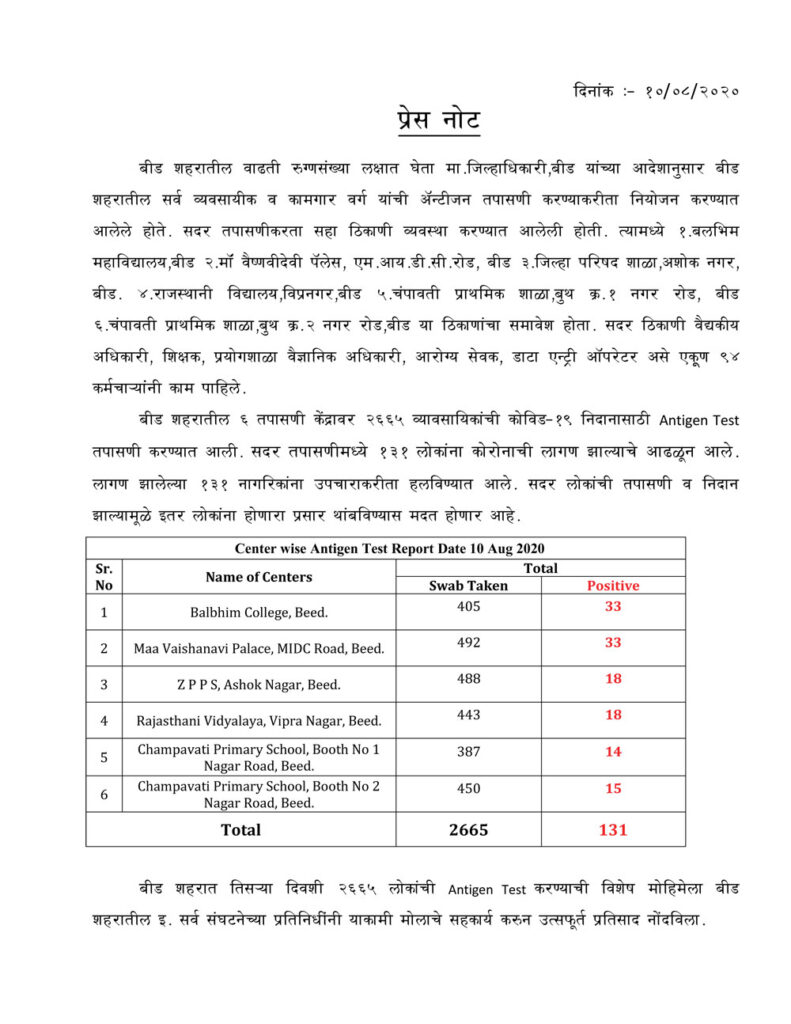 बीड, दि. 9 : जिल्ह्यात कोरोनाचा संसर्ग वाढत असल्याने शहरातील सर्व व्यापार्यांची अॅन्टीजन तपासणी करण्याचा निर्णय जिल्हाधिकारी राहूल रेखावार यांनी घेतल्यानंतर काल शनिवारी सकाळपासून तपासणीला सुरूवात करण्यात आली आहे. आज दिवसभरात 2665 व्यवसायिकांची तपासणी करण्यात आली. यामध्ये 131 जण पॉझीटीव्ह आढळून आले असल्याची माहिती जिल्हा परिषदेचे सीईओ अजित कुंभार यांनी दिली आहे.शहरातल्या 6 केंद्रावर ही तपासणी होत आहे.